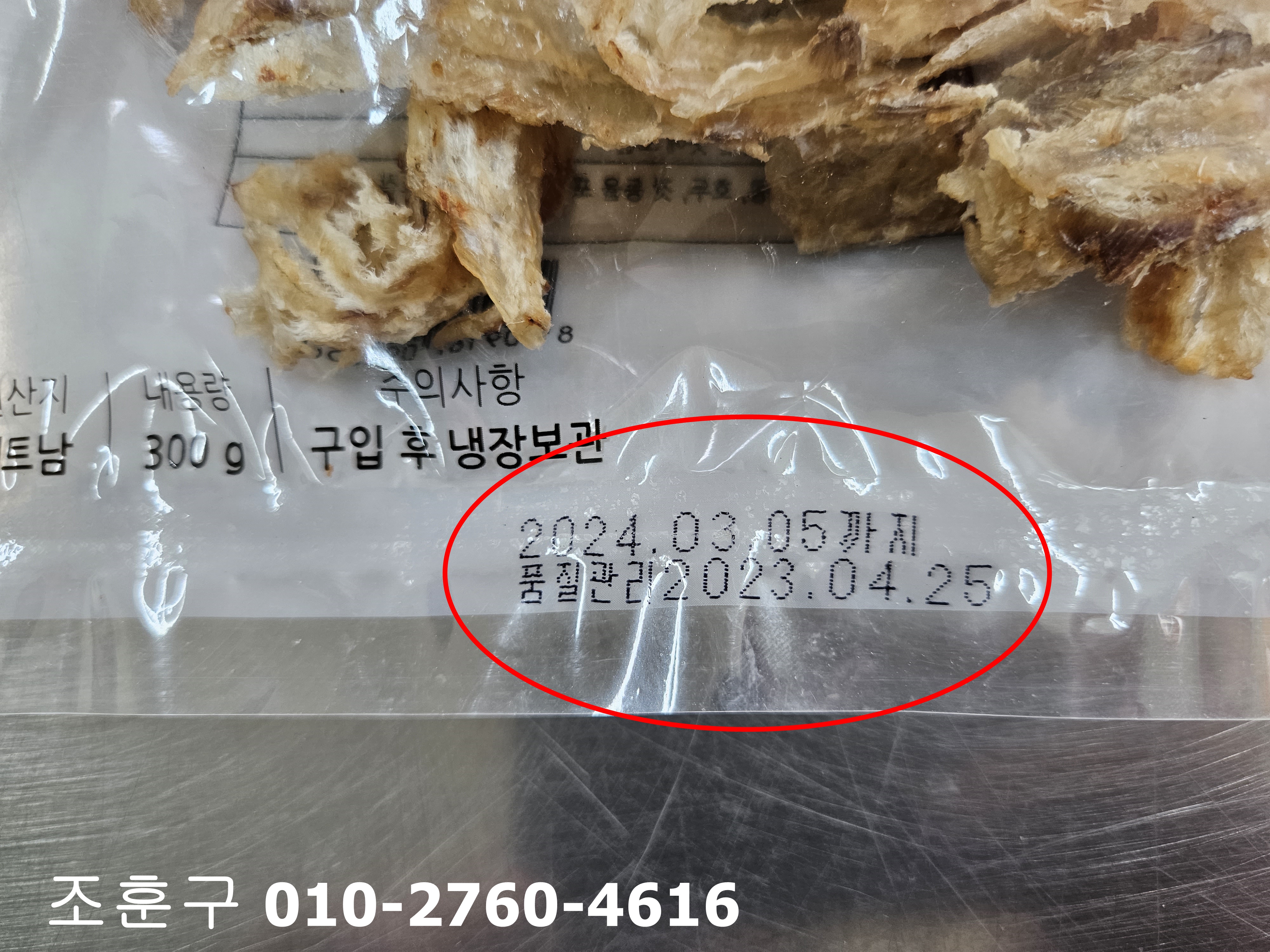 * 잉크젯날인기로 쥐포에 소비기한 및 제품관리번호 날인 사진